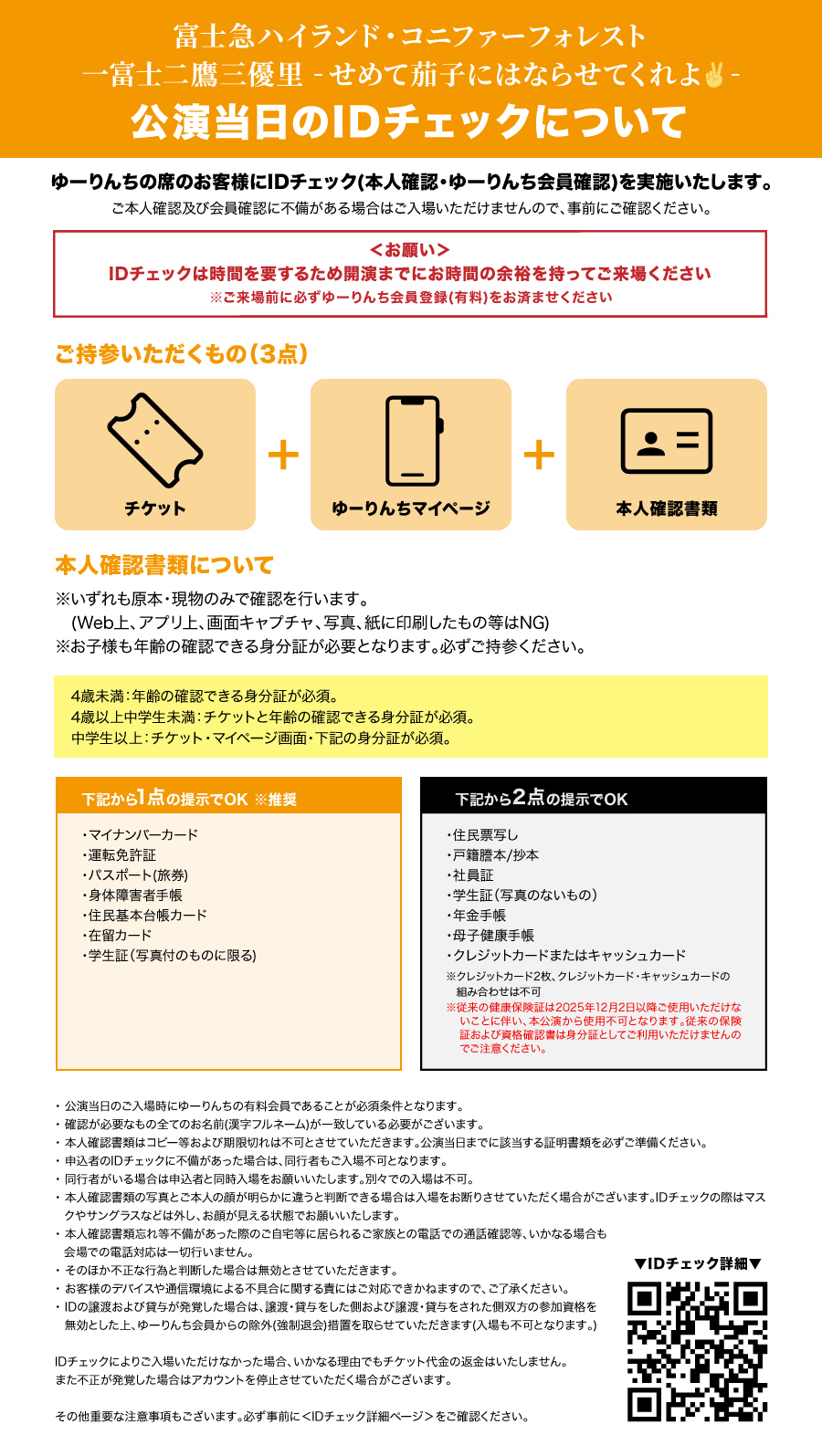 本ページの内容ならびに注意事項をお読みになった上でもIDチェックに関して不安がある場合は、事前にゆーりんち事務局にお問い合わせください(公演日間近の問合せは返信いたしかねる場合がございます)。